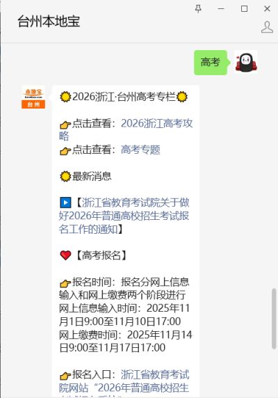 温馨提示:微信搜索公众号【台州本地宝】,关注后在对话框回复【高考】,可获2026浙江省高考报名/缴费时间、官网入口、报名条件、办法等最新消息