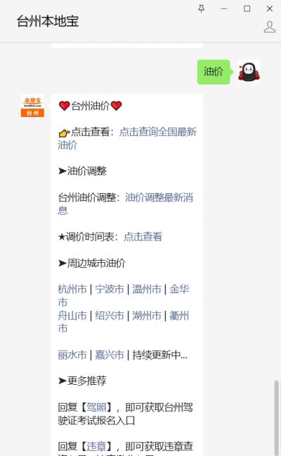 温馨提示:微信搜索公众号【台州本地宝】,关注后在对话框回复【油价】,可获全国油价查询入口,台州最新油价调整消息,周边城市油价信息,加油金额计算器