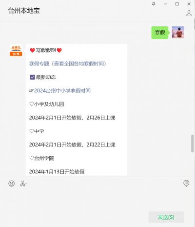 温馨提示:微信搜索公众号台州本地宝,关注后在对话框回复【寒假】,可获台州各大学校寒假放假时间安排(中小学、幼儿园、高中、台州学院等高校)、开学时间、假期免费游景区、预约入口等。